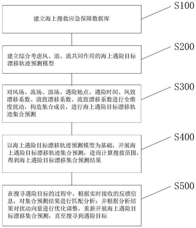 以海上遇险目标漂移轨迹预测模型为基础,开展海上遇险目标漂移轨迹集合预测,进而计算搜救范围,得到海上遇险目标漂移集合预测结果;
