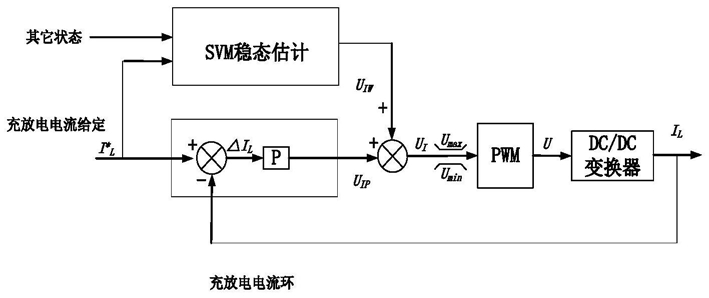 阶段2:为加快超级电容充放电由暂态到稳态的过程,将训练好的支持向量机用于超级电容充放电电流控制,充放电状态信号作为支持向量机的输入,支持向量机的输出即作为P控制器稳态值输出,既将给定充放电电流I*L与实际电流IL相减,经比例控制器控制器,输出信号UIP再与支持向量机的输出UIW相叠加,叠加后的控制信号UI经限幅后对PWM进行控制,实现超级电容充放电快速稳定控制:UI=UIP+UIW (10)