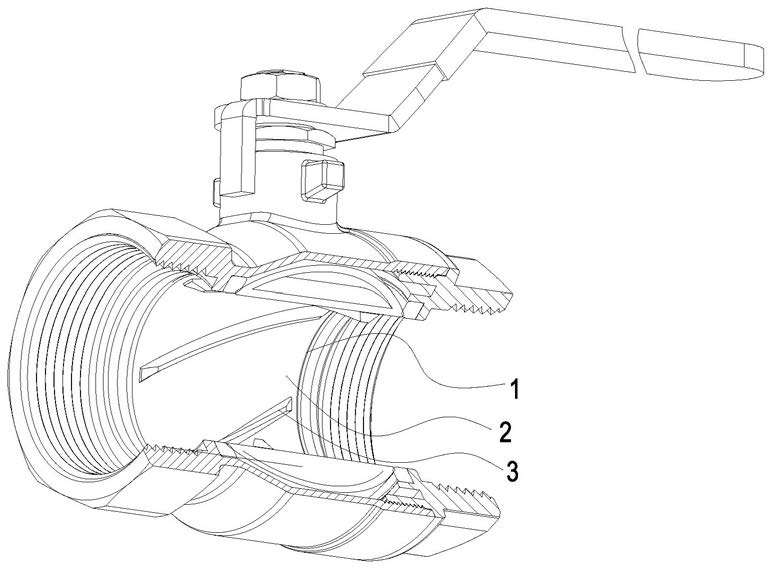 1.一种消音球阀,包括一阀球(1),在阀球(1)内孔(2)制有导流筋(3),导流筋(3)与阀球(1)中心线的夹角成 3°至 50° ,其特征在于:阀球(1)为金属材质,导流筋(3)是硅酮胶材质,导流筋(3)粘合在阀球(1)内孔(2)上;