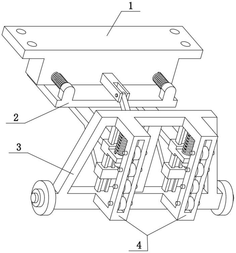 5)和下滑套(2-6),两个前伸板(2-9)的下端均固定连接有斜筋板(2-5),两个斜筋板(2-5)的前端均固定连接有下滑套(2-6),两个下滑套(2-6)分别位于两个上滑套(2-8)的下端。