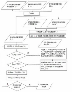 4.根据权利要求1所述的一种基于标准遥感图像的遥感图像缺失数据修复方法,其特征在于,所述的对无数据缺失的参照遥感图像T01、存在数据缺失的待修复遥感图像T02和数字高程模型数据DEM进行几何配准,其中的几何配准是指将不同时间、不同遥感器系统所获得的同一地区的遥感图像数据,经几何投影变换至相同的投影坐标系,使同名像点在位置上和方位上完全叠合的操作。