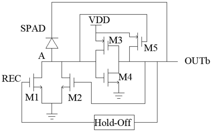 1.单光子雪崩二极管探测器的快速淬灭/复位电路,包括第一MOS管M1、第二MOS管M2、第三MOS管M3、第四MOS管M4、第五MOS管M5和延迟保持电路;其特征在于:第一MOS管M1、第二MOS管M2及第四MOS管M4为NMOS管;第三MOS管M3及第五MOS管M5为PMOS管;第一MOS管M1、第二MOS管M2、第三MOS管M3的漏极、第四MOS管M4及第五MOS管M5的栅极均接雪崩二极管的阳极;第二MOS管M2、第三MOS管M3的栅极、第四MOS管M4及第五MOS管M5的漏极均接雪崩二极管的阴极;第一MOS管M1、第二MOS管M2及第四MOS管M4的源极均接地GND;第三MOS管M3及第五MOS管M5的源极均接外部电压VDD;第一MOS管M1的栅极接延迟保持电路的复位输出信号端;