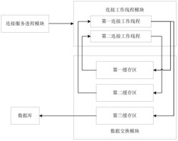 连接工作线程模块,包括连接服务进程模块创建的第一连接工作线程和第二连接工作线程,其中第一连接工作线程将从第一物联网设备收到的第一类数据放到数据交换模块的第一缓存区中,并从数据交换模块的第二缓存区中读取的第二类数据发送给第一物联网设备;第二连接工作线程将从第二物联网设备收到的第二类数据放到数据交换模块的第二缓存区中,并从数据交换模块的第一缓存区中读取第一类数据发送给第二物联网设备,从而实现第一物联网设备与第二物联网设备之间的双向数据交换。