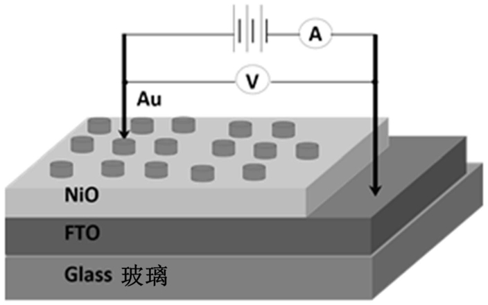 步骤二:电压扫描模式准备:在FTO下电极和Au上电极之间串联连接电流表和可变的电源,在电流表和可变的电源的两端并联连接电压表;
