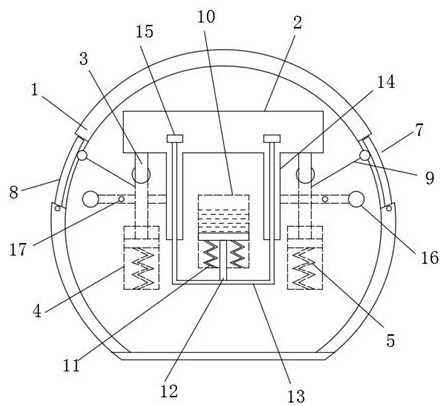 1.一种路面反光镜自动清洗机构,包括镜体(1),其特征在于,所述镜体(1)的后侧壁上设有雨水收集槽(2),所述镜体(1)的后侧壁上开设有两个插口,所述雨水收集槽(2)的下侧壁一体成型有插设在插口内的插杆(3),所述镜体(1)的内部固定两个位于插杆(3)下端的收纳槽(4),每个所述收纳槽(4)内均滑动有滑板,每个所述滑板的下侧壁与收纳槽(4)的下侧壁之间固定连接有第一伸缩弹簧(5),每个所述插杆(3)的下端均延伸至其中一个收纳槽(4)内与滑板的上侧壁固定连接,所述镜体(1)的外壁上开设有两个透光口(7),每个所述透光口(7)内均通过转轴转动连接有遮光板(8),每个所述遮光板(8)的内侧壁均与其中一个插杆(3)之间固定连接有拉绳(9),所述镜体(1)内设有喷水机构;