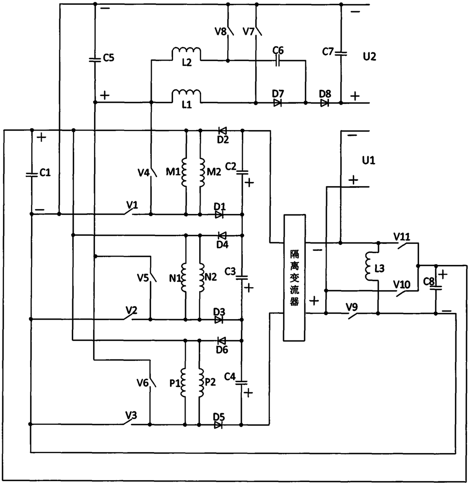 1.双端口自励双直流输出的开关磁阻发电机变流系统,由第一电容器、第二电容器、第三电容器、第四电容器、第五电容器、第六电容器、第七电容器、第八电容器、第一开关管、第二开关管、第三开关管、第四开关管、第五开关管、第六开关管、第七开关管、第八开关管、第九开关管、第十开关管、第十一开关管、第一相绕组、第二相绕组、第三相绕组、第一二极管、第二二极管、第三二极管、第四二极管、第五二极管、第六二极管、第七二极管、第八二极管、第一电感、第二电感、第三电感、隔离变流器组成,其技术特征是,所述第一电容器正极连接所述第一相绕组一端、所述第二二极管阴极、所述第二相绕组一端、所述第四二极管阴极、所述第三相绕组一端、所述第六二极管阴极、所述第八电容器正极、所述第十开关管阴极、所述第十一开关管阴极,第一电容器负极连接所述第一开关管阴极、所述第二开关管阴极、所述第三开关管阴极、所述第五电容器负极、所述第八开关管阴极、所述第七开关管阴极、所述第七电容器负极、所述第九开关管阴极、第八电容器负极、所述第三电感一端,第一相绕组另一端连接第一开关管阳极、所述第一二极管阳极、所述第四开关管阳极,第二相绕组另一端连接第二开关管阳极、所述第三二极管阳极、所述第五开关管阳极,第三相绕组另一端连接第三开关管阳极、所述第五二极管阳极、所述第六开关管阳极,第二二极管阳极连接所述第二电容器负极、所述隔离变流器输入负极端,第二电容器正极连接第一二极管阴极、所述第三电容器负极、第四二极管阳极,第三电容器正极连接第三二极管阴极、所述第四电容器负极、第六二极管阳极,第四电容器正极连接第五二极管阴极、隔离变流器输入正极端,第四开关管阴极连接第五开关管阴极、第六开关管阴极、第五电容器正极、所述第一电感一端、所述第二电感一端,第一电感另一端连接第七开关管阳极、所述第七二极管阳极,第二电感另一端连接第八开关管阳极、所述第六电容器一端,第六电容器另一端连接第七二极管阴极、所述第八二极管阳极,第八二极管阴极连接第七电容器正极,隔离变流器输出正极端连接第九开关管阳极、第十开关管阳极,隔离变流器输出负极端连接第三电感另一端、第十一开关管阳极;第一相绕组由第一相绕组第一支绕组、第一相绕组第二支绕组组成,其技术特征是,所述第一相绕组第一支绕组和第一相绕组第二支绕组并联连接;第二相绕组由第二相绕组第一支绕组、第二相绕组第二支绕组组成,其技术特征是,所述第二相绕组第一支绕组和所述第二相绕组第二支绕组并联连接;第三相绕组由第三相绕组第一支绕组、第三相绕组第二支绕组组成,其技术特征是,所述第三相绕组第一支绕组和所述第三相绕组第二支绕组并联连接。2.根据权利要求1所述的双端口自励双直流输出的开关磁阻发电机变流系统的控制方法为:当本发明的双端口自励双直流输出的开关磁阻发电机变流系统工作期间,需结合开关磁阻发电机的运行原理,根据实时的转子位置信息,各相绕组先后投入工作,每相绕组工作期间分为励磁阶段和发电阶段,并分时进行;当第一相绕组需投入工作时,首先闭合第一开关管,第一相绕组进入励磁阶段,根据转子位置信息及第一相绕组电流信息,励磁阶段结束的条件为到达需最迟关断的转子位置,如果没有到达最迟关断的转子位置但第一相绕组电流已达所需的电流值,则励磁阶段结束即关断第一开关管,进入发电阶段,发电阶段期间第四开关管的开关状态条件为:当第一电容器侧励磁电压在正常值范围以内时,第四开关管为闭合导通状态,当第一电容器侧励磁