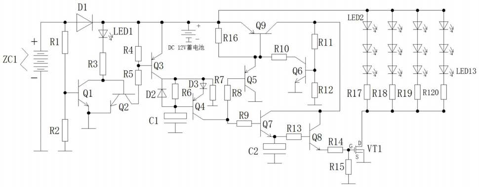 其中,电阻R1一端和二极管D1正极接至太阳能电池板ZC1的正极端,太阳能电池板ZC1的负极端接地;所述电阻R1另一端和电阻R2一端均接至三极管Q1基极,电阻R2另一端和三极管Q1发射极均接地,所述二极管D1负极分别接至红色发光管LED1正极、电阻R4一端、三极管Q3发射极、蓄电池正极端、电阻R16一端、三极管Q9发射极及白色发光管LED2-LED13正极,所述红色发光管LED1负极经电阻R3分别接至三极管Q1集电极和三极管Q2基极,所述三极管Q2发射极接至三极管Q1发射极,所述三极管Q2集电极经电阻R5接至电阻R4另一端和三极管Q3基极,所述三极管Q3集电极接至二极管D2负极、电阻R6一端、二极管D3正极及电阻R7一端,所述电阻R7另一端接地,所述二极管D2正极、电阻R6另一端及电容C1一端均接至三极管Q4基极,电容C1另一端接地,所述三极管Q4集电极分别接至电阻R8一端和电阻R9一端,所述电阻R8另一端接至三极管Q5基极,三极管Q5发射极接地,三极管Q5集电极分别接至电阻R16另一端、电阻R10一端及三极管Q9基极,所述电阻R10另一端接至三极管Q6集电极,三极管Q6发射极接地,三极管Q6基极接至电阻R11和电阻R12一端,电阻R11另一端接至三极管Q9集电极,电阻R12另一端接地,所述三极管Q9集电极还接至三极管Q7集电极和三极管Q8集电极;