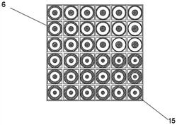 1.一种涡旋型的多层超表面阵列天线,其特征在于:该阵列天线由两个以上移相单元(15)排列组成的阵列相位板(6);所述移相单元(15)包括包括上下连接的上介电层(1)和下介质层(2),所述上介质层(1)和下介质层(2)均为边长为3mm正方形;所述上介质层(1)的上表面、上介质层(1)与下介质层(2)的连接面、下介质层(2)的底面均设有金属贴片(3);所述的金属贴片(3)由外圆环(4)和内圆环(5)组成,外圆环(4)、内圆环(5)的圆心与正方形的中心重合;所述外圆环(4)的外圆与正方形相切;所述的阵列相位板(6)按逆时针划分有第一象限(7)、第二象限(8)、第三象限(9)、第四象限(10)、第五象限(11)、第六象限(12)、第七象限(13)和第八象限(14),每个象限内金属贴片(3)的外圆环(4)的内半径相同,且外圆环(4)的内半径随第一象限(7)至第八象限(14)依次减小。2.根据权利要求1所述的涡旋型的多层超表面阵列天线,其特征在于:所述的阵列天线为正方形,由6×6个移相单元组成。3.根据权利要求2所述的涡旋型的多层超表面阵列天线,其特征在于:所述第一象限(7)、第三象限(9)、第五象限(11)和第七象限(13)中的移相单元的数量相等;所述第二象限(8)、第四象限(10)、第六象限(12)和第八象限(14)中的移相单元的数量相等。4.根据权利要求3所述的涡旋型的多层超表面阵列天线,其特征在于:所述第一象限(7)、第三象限(9)、第五象限(11)和第七象限(13)中的移相单元的数量为6个;所述第二象限(8)、第四象限(10)、第六象限(12)和第八象限(14)中的移相单元的数量为3个。5.根据权利要求4所述的涡旋型的多层超表面阵列天线,其特征在于:所述第一象限(7)至第八象限(14)中移相单元上的金属贴片(3)的外圆环(4)的内半径分别为1 .4mm、1.347mm、1.121mm、0.997mm、0.924mm、0.868mm、0.793mm、0.732mm。6.根据权利要求1所述的涡旋型的多层超表面阵列天线,其特征在于:所述外圆环(4)的内半径是内圆环(5)的外半径的2倍。7.根据权利要求1所述的涡旋型的多层超表面阵列天线,其特征在于:所述内圆环(5)的内半径为0.1mm。8.根据权利要求1所述的涡旋型的多层超表面阵列天线,其特征在于:所述上介电层(1)和下介质层(2)的介电常数均为2.0,厚度为0.7-1mm。9.根据权利要求8所述的涡旋型的多层超表面阵列天线,其特征在于:所述上介电层(1)和下介质层(2)的厚度为0.8mm。10.根据权利要求1所述的涡旋型的多层超表面阵列天线,其特征在于:所述金属贴片(3)的厚度为0.035mm。