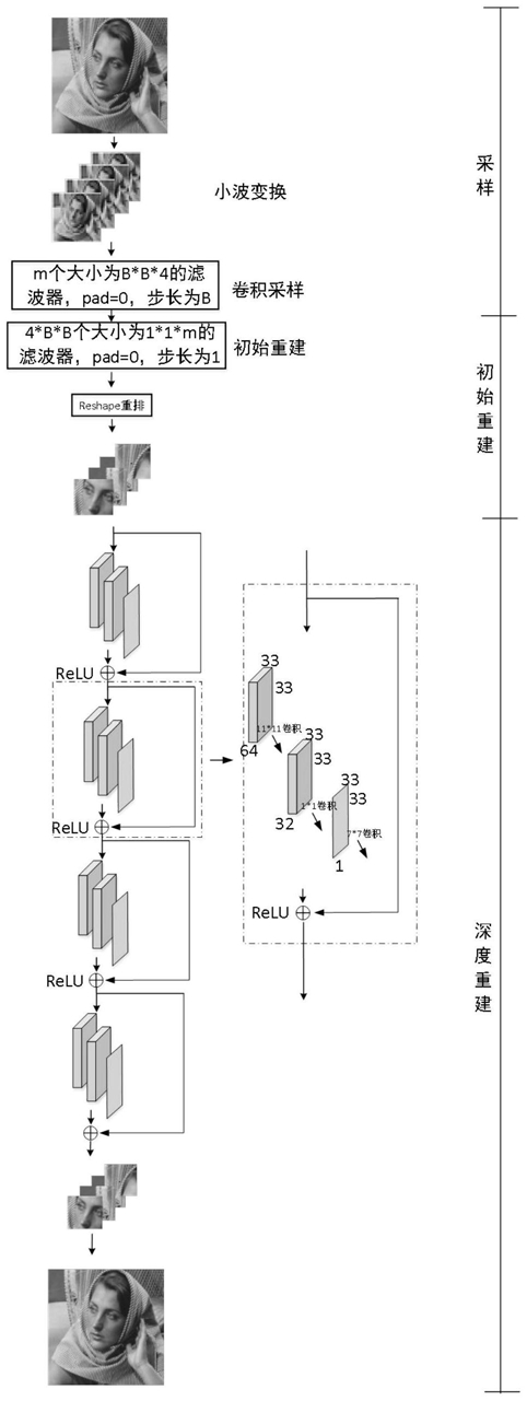 S3:深度重建阶段,采用四个残差块来深度重建图像,2‑3)中的初始重建图像块作为输入,输出大小为B×B的深度重建图像;
