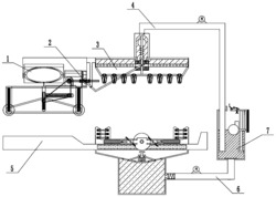 所述储水装置(7)包括储水箱体(7‑1)、下侧矩形通孔(7‑2)、内端浮球滑杆(7‑3)、表量尺(7‑4)、浮球(7‑5)、浮球凸台(7‑6)、抽水管连管(7‑7)、加水孔(7‑8)、上侧闭合杆(7‑9)、驱动连接杆(7‑10)、上侧推杆(7‑11)、推杆套簧(7‑12)、弧形杆(7‑13)、铰接支架(7‑14)和中端铰接杆(7‑15),下侧矩形通孔(7‑2)设置在储水箱体(7‑1)的下端,内端浮球滑杆(7‑3)固定连接在储水箱体(7‑1)内端面的上侧,表量尺(7‑4)固定连接在储水箱体(7‑1)的外壁上,浮球(7‑5)与内端浮球滑杆(7‑3)滑动连接,浮球凸台(7‑6)与浮球(7‑5)固定连接,抽水管连管(7‑7)与储水箱体(7‑1)固定连接,并且抽水管连管(7‑7)与储水箱体(7‑1)的内端连通,加水孔(7‑8)设置在储水箱体(7‑1)上端面的中端,铰接支架(7‑14)和中端铰接杆(7‑