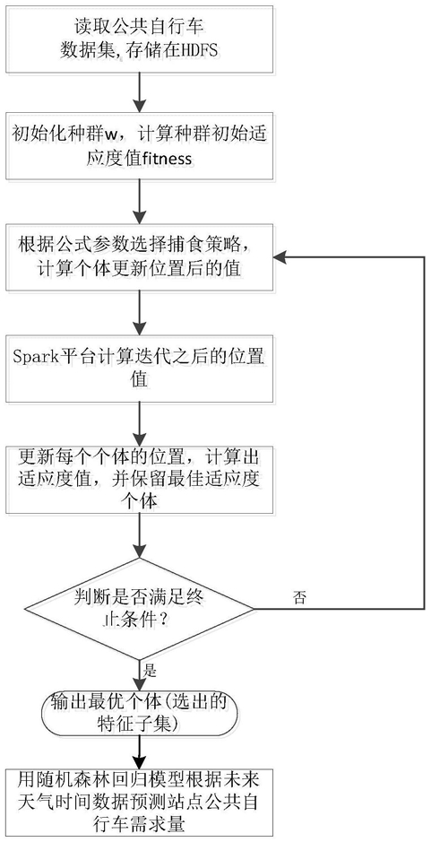 1.一种基于分布式鲸鱼优化算法的公共自行车需求量预测方法,其特征在于,包括以下步骤:步骤1:读取原始公共自行车数据集,并对原始数据集进行预处理,然后利用Spark中的RDD分区将训练集分成若干RDD数据集,存储在适合运行在Spark上的分布式文件系统HDFS中;