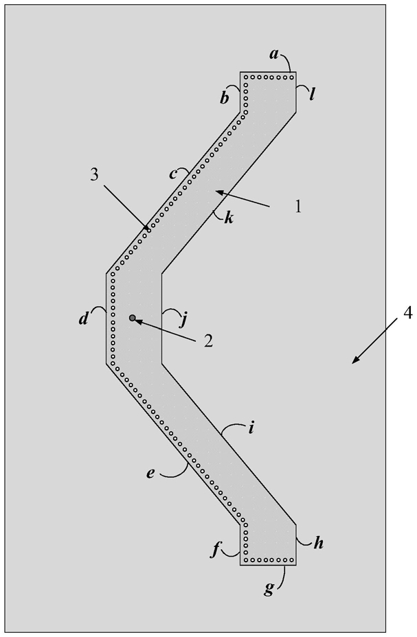 3.如权利要求2所述的折线型的定向微带天线,其特征在于,所述辐射贴片(1)的两组折线段包括竖直线段(b、d、f、h、j、l)和斜线段(c、e、i、k)。
