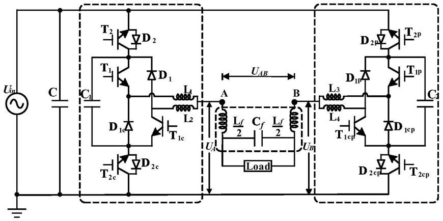 所述单相交流电源的输出端与所述dual-buck型所述功率变换单元的输入端连接,所述单相交流电源的输出端与所述dual-buck型所述功率变换单元的输入端之间连接所述输入滤波电容C,所述dual-buck型所述功率变换单元包括正极性桥臂和负极性桥臂,所述正极性桥臂的输出端A和所述负极性桥臂的输出端B连接所述LC低通滤波器的输入端,所述LC低通滤波器的输出端连接负载部分;