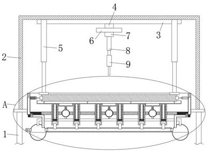 2.根据权利要求1所述的一种电气自动化板材切割设备,其特征在于,所述切割机构包括固定在U形架(2)底部且轨道朝下设置的第一电动滑轨(3),所述第一电动滑轨(3)上设有与其配套的第一电动滑块(4),所述第一电动滑块(4)的底部侧壁固定连接有轨道朝下设置的第二电动滑轨(6),所述第二电动滑轨(6)上设有与其配套的第二电动滑块(7),所述第二电动滑块(7)的底部固定连接有第二自动伸缩杆(8),所述第二自动伸缩杆(8)的伸缩端固定连接有切割机(9)。
