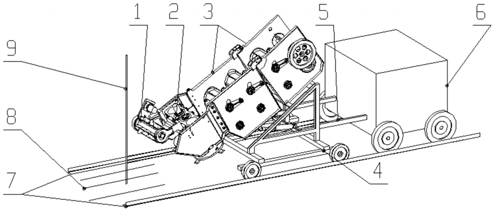 9.按照权利要求1至8中任一项所述的一种甘蔗收割机切割系统切割输送性能试验台的试验方法,其特征在于:选择性的对以下参数进行调节,为甘蔗收割机切割输送性能提供数据支持:调节台车的运行速度以调节试验台的运行速度,调节推倒辊筒装置的推倒辊筒的转速,调节推倒辊筒装置的推倒辊筒的安装位置以调整压蔗角度,调节割台装置的刀盘转速,调节输送切段装置的喂入滚筒的转速,调节输送切段装置的输送滚筒的转速,调节输送切段装置的切段滚筒的转速,调节输送切段装置的前段的角度以调节割台装置入土切割甘蔗的角度;