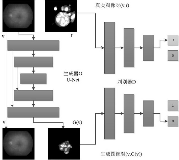 (3)构建判别网络,通过深度全卷积神经网络构建图像判别器,用于判断送入判别网络中的病灶概率图的真实性,同时判断其是否与眼底视网膜图像匹配;