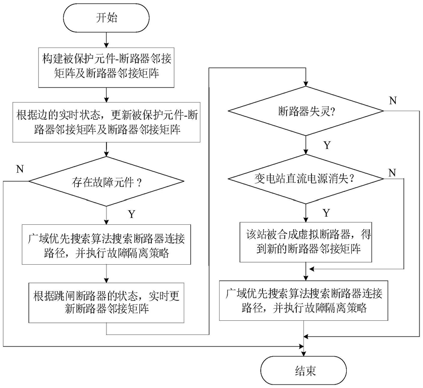 1)设定故障元件为源顶点,由于广度优先搜索算法是一种按照逐层递增次序搜索各顶点到源顶点最短路径的方法,可设置层数门槛Cth,减小跳闸断路器的搜索范围,该值的选取应由跳闸断路器的限定搜索范围而定,可设定为4~6之间;2)通过广度优先搜索算法得到各层数C对应的路径集合PC,p,对于某个层数C,从其路径集合PC,p中提取各终点断路器,形成该层数的跳闸断路器集合TC;其中,某路径集合PC,p记录从源顶点到层数C的最短路径中所有有序存放的顶点;层数C含义如下:其中,层数C的大小表征跳闸断路器与源顶点的连接次序,层数C越小与源顶点越靠近;因此,按照层数递增的顺序执行跳闸决策可保证最小范围内切除故障。5.根据权利要求1所述的一种广度优先搜索算法的电网故障隔离方法,其特征在于,所述步骤四断路器失灵后的故障隔离策略包括:实时监测步骤三中故障元件两端的断路器是否正确跳闸,对跳闸的断路器按照步骤二中实时修正断路器邻接矩阵D中该跳闸的断路器所对应的元素;若发生断路器失灵,则以该失灵断路器为源顶点,对修正后的断路器邻接矩阵D执行广度优先搜索算法,得到各层数C的路径集合PC,p,从层数C=1的路径集合P1,p中提取各路径的终点断路器形成跳闸断路器集合T1;当断路器失灵时,以层数C递增的次序跳开对应层数的跳闸断路器集合TC中的各断路器,当路径集合PC,p中某条路径包含已经跳开的断路器,则该路径对应集合TC中的断路器的跳闸命令终止;否则,继续按照层数递增的次序执行跳闸,直到故障被隔离。6.根据权利要求1所述的一种广度优先搜索算法的电网故障隔离方法,其特征在于,所述步骤五变电站直流电源消失后的故障隔离策略包括:根据是否监测到变电站直流电源消失,分为两种处理模式;第一种处理模式是针对已经监测到直流电源消失的变电站,对步骤二中新的断路器邻接矩阵D′执行广度优先搜索算法,得到各层数C的路径集合PC,p,后续处理方式同步骤四;第二种处理模式是针对未识别直流电源消失的变电站,按照连续断路器失灵来处理,即按照步骤四的处理方式隔离故障。