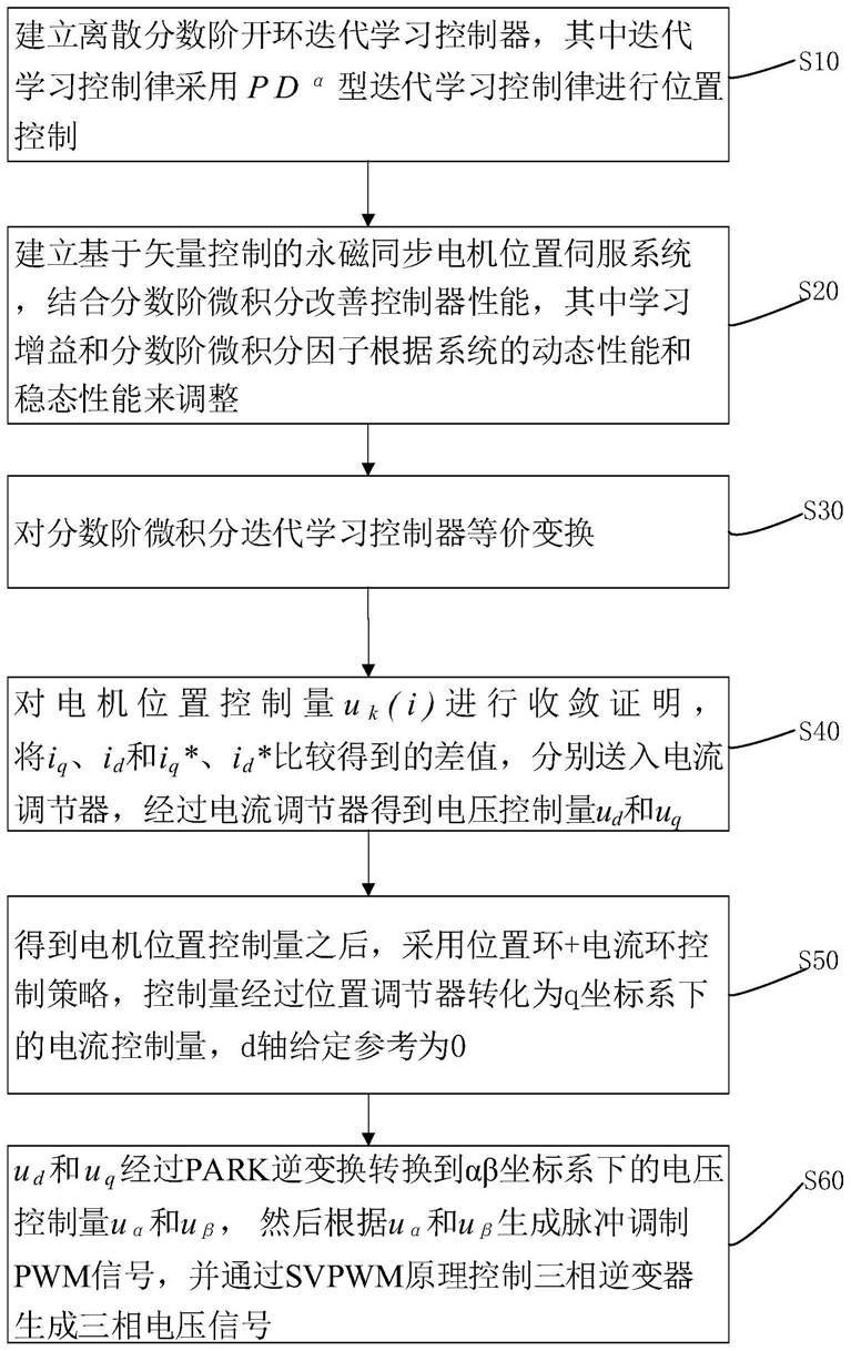 2.采用权利要求1所述基于分数阶微积分的开环迭代学习的控制方法的系统,其特征在于,包括离散分数阶开环迭代学习控制器、电流调节器、DSP微处理器、逆变电路和位置传感器,其中,所述位置传感器采集永磁同步电机的位置信息,将给定位置θ*与所述位置传感器反馈的位置θ之差输入所述离散分数阶开环迭代学习控制器,离散分数阶开环迭代学习控制器的输出为转矩即电流指令信号 的参考值为0;