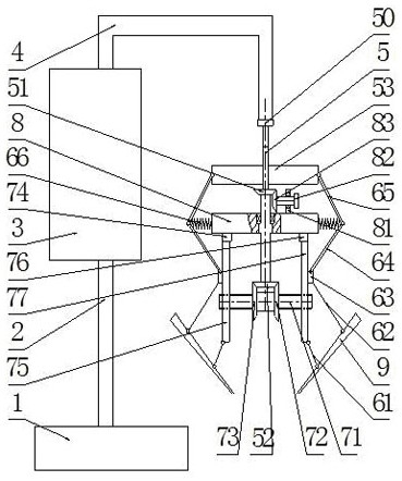 6.如权利要求5所述的一种多杆联动快速挖坑松土机器人,其特征在于,所述转轴(5)自上而下依次装设有所述升降板(53)、锥齿轮D(51)、转轴支架板(8)和锥齿轮C(52);所述锥齿轮C(52)同时与所述锥齿轮A(72)和锥齿轮B(73)相啮合;所述转轴支架板(8)内部设有轴承孔,所述转轴(5)穿过滚动轴承放置于所述轴承孔内。