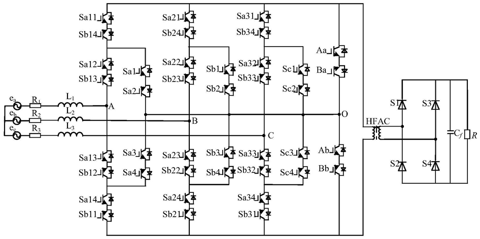 5.根据权利要求1或2所述的三相三电平高频链矩阵式整流器拓扑,其特征在于:在所述电源网络中,三相电网电压ea的正极与线路阻抗R1相连;三相电网电压eb的正极与线路阻抗R2相连;三相电网电压ec的正极与线路阻抗R3相连;线路阻抗R1与网侧输入滤波电感L1的一端相连;线路阻抗R2与网侧输入滤波电感L2的一端相连;线路阻抗R3与网侧输入滤波电感L3的一端相连;三相电网电压ea、eb、ec的负极相连。