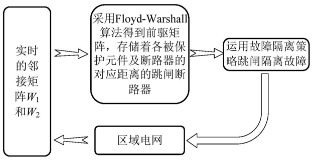 S2、基于Floyd-Warshall算法对所述被保护元件—断路器邻接矩阵W1和断路器邻接矩阵W2进行搜索,得到最短路径值矩阵D和每个被保护元件及断路器的前驱矩阵P,基于回溯法得到前驱矩阵P中各被保护元件的距离为 的跳闸断路器集合S3、当识别故障元件后,将单一故障元件或若干个故障元件设定为源点,在故障元件为源点的跳闸断路器集合 中查找到距离故障元件最近的断路器,并向所述断路器发送跳闸指令;若故障元件两端的某个断路器失灵,则从以失灵断路器为源点的跳闸断路器集合中找到跳闸断路器,并按照距离值递增的顺序隔离故障;若某一跳闸路径包含了已经跳闸的断路器时,则该路径的跳闸命令终止。