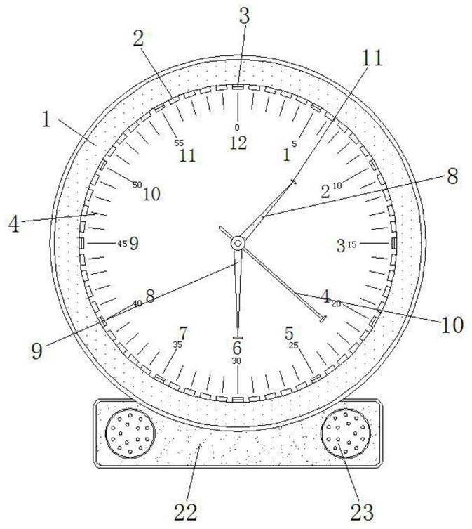 9.根据权利要求1所述的一种具有语音播报功能的学前教育认时盘,其特征在于:所述底座(22)与表盘(1)之间为固定连接,且底座(22)上对称分布有语音播报音箱(23)。
