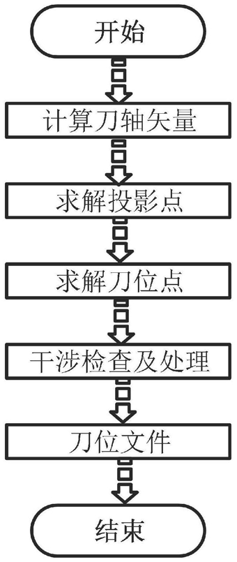 步骤四:求解点P1t沿刀轴矢量的负方向投影到刀具底面的刀位点C0:利用投影点P1t坐标(x1t、y1t、z1t)求解出P1t沿刀轴矢量的负方向投影到刀具底面的刀位点C0坐标(x、y、z),即C0为刀触点P1的刀位点;