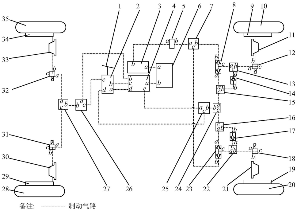制动阀(2)的进气端口a与主储气罐(4)的出气端口d通过气路相连,制动阀(2)的进气端口b与主储气罐(4)的出气端口c通过气路相连,制动阀(2)的出气端口c与非驱动轴继动阀(26)的控制端口c通过气路相连,制动阀(2)的出气端口d与驱动轴继动阀(25)的控制端口c通过气路相连;