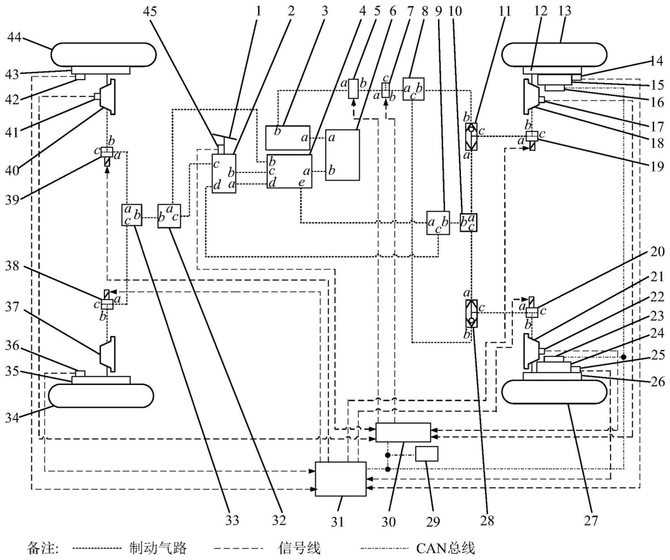由制动踏板(1)、制动阀(2)、副储气罐(3)、主储气罐(4)、开关电磁阀(5)、空气压缩机(6)、驱动轴线性排气电磁阀(7)、第一三通阀(8)、驱动轴继动阀(9)、第二三通阀(10)、右驱动轮双通单向阀(11)、右驱动轮轮速传感器(14)、右驱动轮驱动电机及传动装置(15)、右驱动轮驱动电机控制器(16)、右驱动轮制动压力传感器(17)、右驱动轮制动气室(18)、右驱动轮ABS电磁阀(19)、左驱动轮ABS电磁阀(20)、左驱动轮制动气室(21)、左驱动轮制动压力传感器(22)、左驱动轮驱动电机控制器(23)、左驱动轮驱动电机及传动装置(24)、左驱动轮轮速传感器(25)、左驱动轮双通单向阀(28)、电池管理系统(29)、整车控制器(30)、制动控制器(31)、非驱动轴继动阀(32)、第三三通阀(33)、左非驱动轮轮速传感器(36)、左非驱动轮制动气室(37)、左非驱动轮ABS电磁阀(38)、右非驱动轮ABS电磁阀(39)、右非驱动轮制动气室(40)、右非驱动轮制动压力传感器(41)、右非驱动轮轮速传感器(42)、制动踏板位移传感器(45)组成;