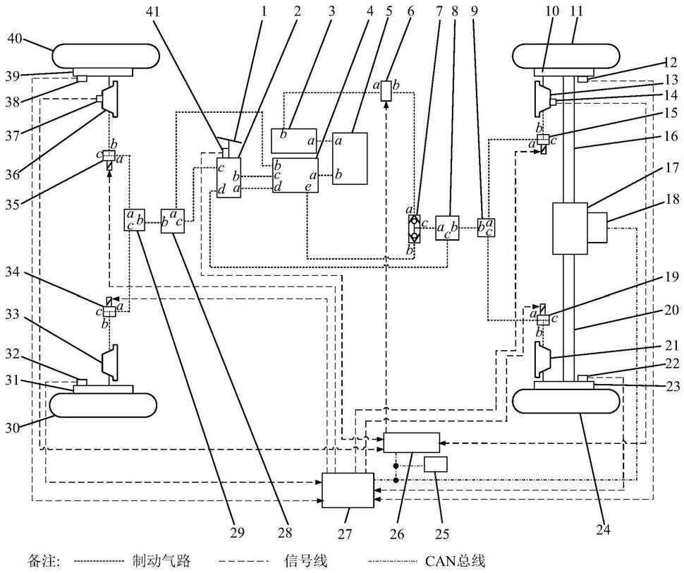 由制动踏板(1)、制动阀(2)、副储气罐(3)、主储气罐(4)、空气压缩机(5)、开关电磁阀(6)、驱动轴叠加式单向阀(7)、驱动轴继动阀(8)、第一三通阀(9)、右驱动车轮轮速传感器(12)、右驱动车轮制动气室(13)、右驱动车轮制动压力传感器(14)、右驱动车轮ABS电磁阀(15)、驱动电机及传动装置(17)、驱动电机控制器(18)、左驱动车轮ABS电磁阀(19)、左驱动车轮制动气室(21)、左驱动车轮轮速传感器(22)、电池管理系统(25)、整车控制器(26)、制动控制器(27)、非驱动轴继动阀(28)、第二三通阀(29)、左非驱动车轮轮速传感器(32)、左非驱动车轮制动气室(33)、左非驱动车轮ABS电磁阀(34)、右非驱动车轮ABS电磁阀(35)、右非驱动车轮制动气室(36)、右非驱动车轮制动压力传感器(37)、右非驱动车轮轮速传感器(38)、制动踏板位移传感器(41)组成;