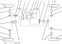 第二三通阀(23)的端口c通过气路与左前驱动车轮ABS电磁阀(22)的进气端口a相连,左前驱动车轮ABS电磁阀(22)的进气端口b通过气路与左前驱动车轮制动气室(21)相连。