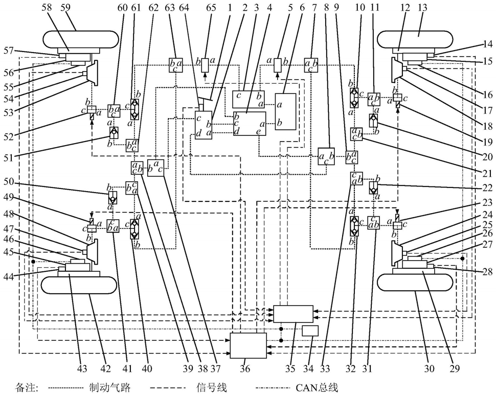 后右驱动车轮ABS电磁阀(19)、后左驱动车轮ABS电磁阀(23)、前左驱动车轮ABS电磁阀(49)、前右驱动车轮ABS电磁阀(52)通过信号线与制动控制器(36)相连;