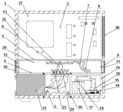 1.一种带UPS功能的计算机集成装置,其特征在于:包括机箱(1),所述机箱(1)内部设有组件室(2)、水冷室(29)和供电室(3),所述供电室(3)设置于水冷室(29)的底部,所述供电室(3)与水冷室(29)之间设有下隔板(4),所述组件室(2)设置于水冷室(29)的顶部,所述组件室(2)与水冷室(29)之间设有上隔板(5);