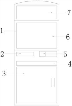 1.一种基于区块链的影院3D影片售票取票一体机,其结构包括机体(1)、取票口(2)、门板(3)、3D眼镜发放装置(4)、二维码扫描处(5)、触摸屏(6)、广告显示屏(7),其特征在于:所述机体(1)从上自下依次内嵌有广告显示屏(7)、触摸屏(6),所述触摸屏(6)下设取票口(2)、二维码扫描处(5),所述机体(1)还连接有门板(3),3D眼镜发放装置(4)。