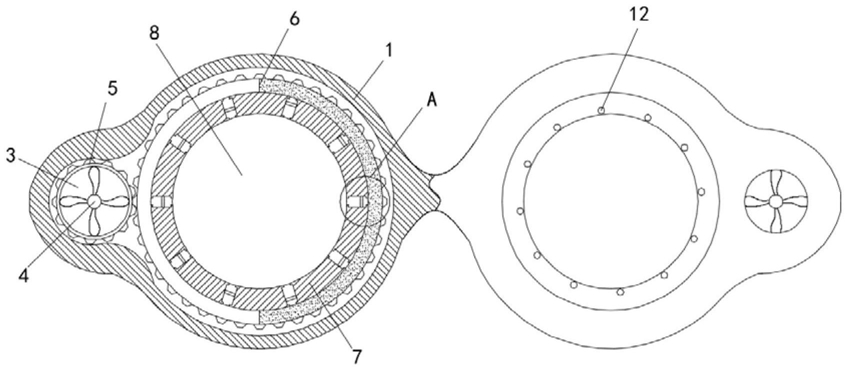 2.根据权利要求1所述的海洋探测用防雾泳镜,其特征在于,所述散热机构包括多个等距阵列设置在散热环(7)内的散热腔(9),所述散热腔(9)贯穿散热环(7)设置,所述散热腔(9)的侧壁上密封滑动连接有磁性滑块(11),所述第二齿圈(6)由两个磁性半环组成,且两个所述半环的磁极相反。