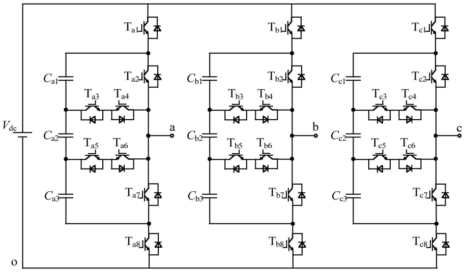 每个桥臂单元中的3个飞跨电容顺向串联,8个绝缘栅双极晶体管中有4个绝缘栅双极晶体管的集电极与发射极顺向串联,3个顺向串联的飞跨电容分别为飞跨电容Cx1、飞跨电容Cx2和飞跨电容Cx3,4个顺向串联的绝缘栅双极晶体管分别为绝缘栅双极晶体管Tx1,绝缘栅双极晶体管Tx2,绝缘栅双极晶体管Tx7和绝缘栅双极晶体管Tx8,其中飞跨电容Cx1的正极与绝缘栅双极晶体管Tx1的发射极与绝缘栅双极晶体管Tx2的集电极之间相连接,飞跨电容Cx1的负极与飞跨电容Cx2的正极相连接,飞跨电容Cx1的负极与绝缘栅双极晶体管Tx2的发射极之间串联有绝缘栅双极晶体管Tx3和绝缘栅双极晶体管Tx4,其中绝缘栅双极晶体管Tx3的集电极与飞跨电容Cx1的负极相连接,绝缘栅双极晶体管Tx3的发射极与绝缘栅双极晶体管Tx4的发射极相连接,绝缘栅双极晶体管Tx4的集电极与绝缘栅双极晶体管Tx2的发射极相连接,飞跨电容Cx2的负极与飞跨电容Cx3的正极相连接,飞跨电容Cx2的负极与绝缘栅双极晶体管Tx7的集电极之间串联有绝缘栅双极晶体管Tx5和绝缘栅双极晶体管Tx6,其中绝缘栅双极晶体管Tx5的集电极与飞跨电容Cx2的负极相连接,绝缘栅双极晶体管Tx5的发射极与绝缘栅双极晶体管Tx6的发射极相连接,绝缘栅双极晶体管Tx6的集电极与绝缘栅双极晶体管Tx7的集电极相连接,飞跨电容Cx3的负极与绝缘栅双极晶体管Tx7的发射极与绝缘栅双极晶体管Tx8的集电极的连接点相连接;