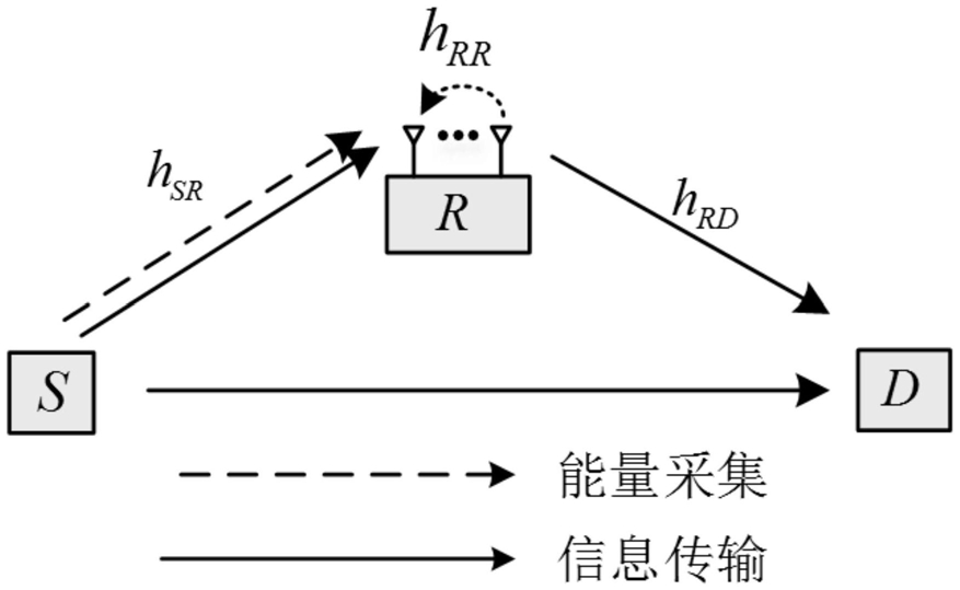 1.一种基于自干扰最小化准则的全双工能量采集中继传输方法,其特征在于,基于时间切换能量采集的全双工放大转发协作中继传输系统,所述系统包括一个源S、一个全双工中继R和一个目的端D,源节点和目的端节点配置单根天线,中继节点配置多根天线;在一个时间块T内,源通过直达链路传输信息到目的端;在第一时隙αT内,中继进行能量采集;第二时隙(1-α)T内,中继接收源信息的同时,放大转发源信息到目的端;全双工能量采集中继传输方法包括:获取目的端接收的信息和对应的第一信噪比;