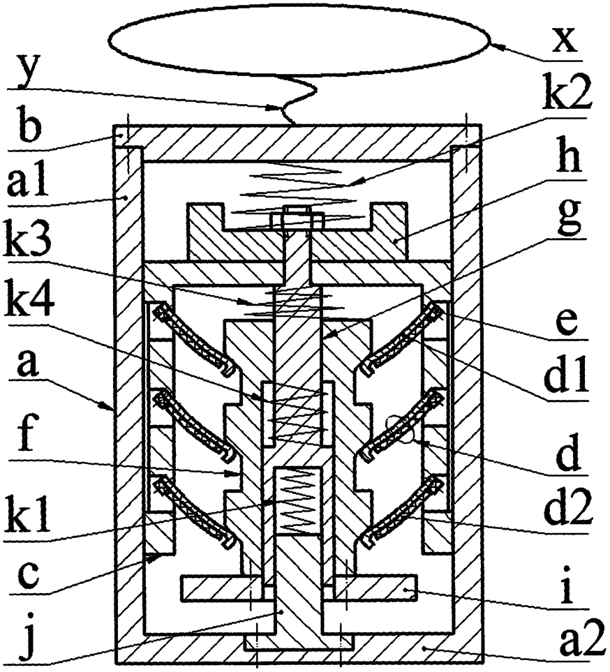 1.一种多用途压电振动发电机,其特征在于:壳体的底壁内侧装有导销、侧壁端部装有端盖,端盖上经绳索系有气囊;支架的横梁左右两端的下方都设有纵梁,纵梁上安装孔的侧壁上设有倾斜的安装面;激励器自上而下设有相互连通且同轴的上下导孔,激励器左右两侧各设有一组凸轮,凸轮面由依次相连的底面、斜面和顶面构成,底面与顶面间的距离为凸轮升程,底面与斜面间所构成的锐角为凸轮升角,凸轮升角为30~50度;阶梯轴自上而下依次设有细轴、中轴及粗轴,粗轴端部设有与其同轴的导孔,导孔套在导销上并将支撑簧压接在导销上;激励器的上下导孔分别套在阶梯轴的中轴和粗轴上,粗轴的轴肩将下簧压接在下导孔的顶壁上,激励器上装有下调频块;支架的横梁及上调频块装在阶梯轴的细轴上,上调频块将缓冲簧压接在端盖上,激励器将套在中轴上的上簧压接在横梁上;支架的安装面上装有压电振子,压电振子为由等厚度基板和压电片粘接而成的悬臂梁结构,基板靠近激励器安装,基板自由端的翻边顶靠在凸轮面上;非工作时基板的翻边与凸轮的斜面的中点接触,压电振子安装产生的预弯变形量为其许用值的一半,压电振子的许用变形量大于凸轮升程。