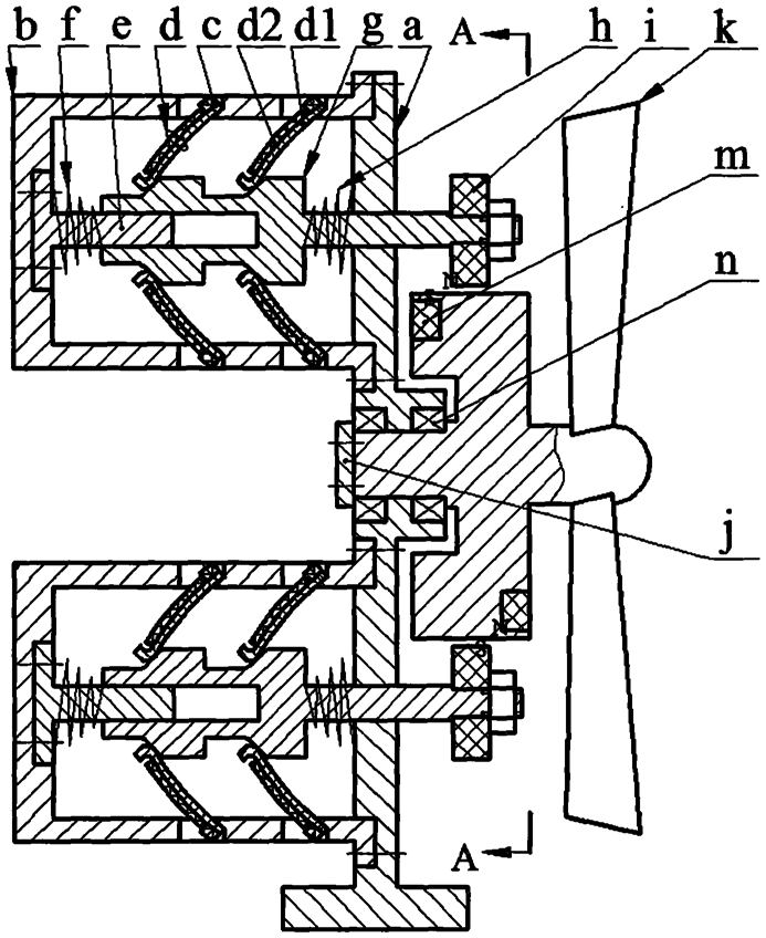 1.一种风致回转式压电俘能器,其特征在于:箱体的箱底上安装有导销、至少两个相对的箱壁上设有带倾斜的安装面的安装孔,箱壁端部安装在支座的立板上;激励器的体块的左右两端分别设有同轴的导孔和导柱、上下两侧都设有一组凸轮,凸轮表面由依次相连的底面、斜面和顶面构成,激励器的导孔套在导销上、导柱套在支座的导孔内,导柱端部装有受激磁铁;导销和导柱上分别套有用于限制激励器位置的左弹簧和右弹簧;压电振子装在箱体的安装面上,压电振子为由基板和压电片粘接而成的悬臂梁型预弯结构,基板预弯半径小于压电片预弯半径,基板靠近激励器安装,压电振子自由端的基板的翻边处顶靠在凸轮的表面上,基板的翻边的凸起侧与凸轮表面接触;转换器的盘体两端分别设有与其同轴的左半轴和右半轴,右半轴端部设有叶片,左半轴装在支座的立板上;盘体左右两端的外缘处都均布地安装有数量相等的激励磁铁;激励磁铁与各受激磁铁之间为吸引力,激励磁铁与各受激磁铁之间作用力为零时受激磁铁距离盘体两端激励磁铁的轴向距离相等,压电振子自由端与凸轮的斜面的中点接触,压电振子预压缩量为其许用变形量的一半,压电振子的许用变形量大于凸轮的升程;左弹簧被压死时压电振子不与凸轮的顶面脱离,右弹簧被压死时压电振子不与凸轮的底面脱离。