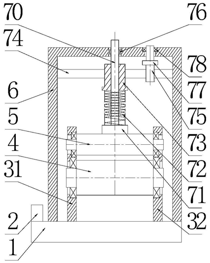 5.根据权利要求3所述的一种调节压力补偿挠度的轧钢机,其特征在于:所述驱动模块包括平行于所述升降杆(70)、其上端穿过滚动轴承(78)装设于所述机架(6)上的转轴(75),固定装设于所述转轴(75)中上部的从动齿轮(77)。
