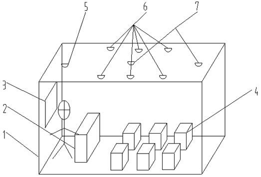 2.根据权利要求1所述的一种微格教室的全场景自动跟踪装置,其特征在于:学生定位追踪系统包括声音捕捉装置、声音分析装置、学生自动跟踪装置;其中声音捕捉装置设置在学生课桌(4)上,能够将捕捉的声音信息传递给声音分析装置,声音分析装置根据捕捉的声音信息分析出声源大体位置,并判断具体的发言学生位置,并将声音分析结果传输给控制模块;学生自动跟踪装置由布置在教室(1)顶部对应学生课桌(4)的多台焦距可调的学生摄像机(6)构成,控制模块能够根据声音分析结果选择对应的学生摄像机(6),并发出焦距调节动作指令以指导对应的学生摄像机(6)工作,保障对发言学生的定位追踪摄像。