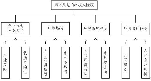 构建园区规划环境风险评估的分层结构模型,所述分层结构模型包括产业结构环境危害单元、环境管理补偿单元、大气环境易损评价指标、水环境易损指标、大气环境影响评价指标、水环境影响评价指标;