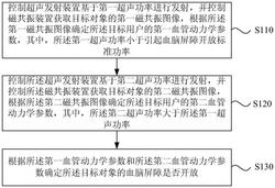 控制超声发射装置基于第一超声功率进行发射,并控制磁共振装置获取目标对象的第一磁共振图像,根据所述第一磁共振图像确定所述目标对象的第一血管动力学参数,其中,所述第一超声功率小于引起血脑屏障开放标准功率;