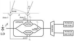 1.基于双平行马赫增德尔调制器的到达角无模糊测量方法,包括激光二极管LD,双平行马赫增德尔调制器DPMZM,密集型波分复用器DWDM,光功率计,其特征在于:LD发出的光载波进入DPMZM,DPMZM的上下子调制器分别调制相距半波长的两天线接收的射频信号,子调制器全都偏置在最小点进行抑制载波双边带调制,控制DPMZM的主调制器偏压在两子调制器之间引入特定相移,DPMZM的输出信号进入DWDM将上下边带分成两路后由光功率计测量每路功率,得到两组功率值并构建两条功率相位映射曲线,根据得到的两条不同的功率映射曲线,在360度相位范围内无模糊映射出信号在两天线端的相位差,在180度方向范围内计算出到达角。