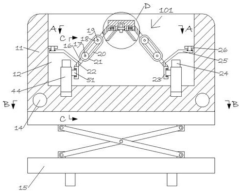 所述固定块固定安装在所述中间板底面,所述固定块上转动安装所述传动杆,所述传动杆上固定安装所述轮子,所述固定块后侧面固定安装所述辅助块,所述辅助块内设有开口向前的所述辅助腔,所述辅助腔的一侧内壁内固定安装所述第二电机,所述第二电机的输出轴上固定安装所述移动杆,所述移动杆上固定安装所述第三齿轮,后侧的所述传动杆上固定安装所述第四齿轮,所述第四齿轮与所述第三齿轮之间传动安装所述第二链条。