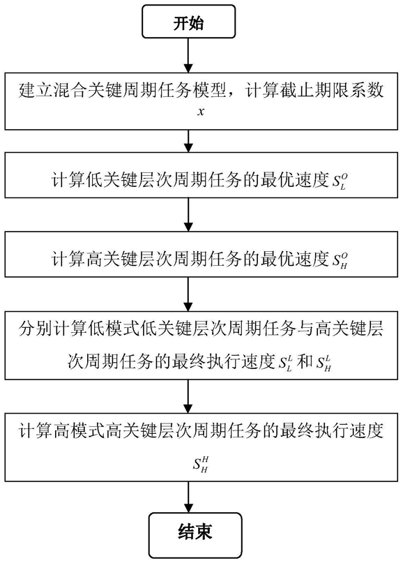 Ci(LO)和Ci(HI)分别为混合关键周期任务τi在低模式和高模式下的执行时间;如果混合关键周期任务τi为低关键层次周期任务时,其Ci(HI)=Ci(LO);如果混合关键周期任务τi为高关键层次周期任务时,其Ci(HI)>=Ci(LO);所谓低模式是指所有高关键层次任务在速度S下的执行时间不超过Ci(LO)/S,且同时执行高关键层次任务和低关键层次任务;所谓高模式是指高关键层次任务在速度S下的执行时间超过Ci(LO)/S,只执行高关键层次任务;所有截止期限系数x由下式计算:x=1-M