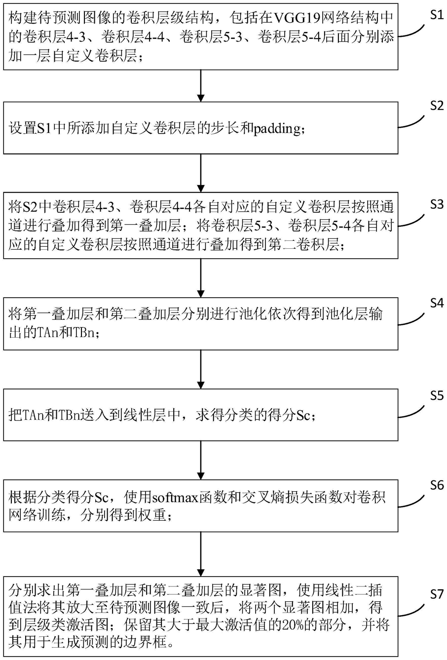 S7、分别求出第一叠加层和第二叠加层的显著图,使用线性二插值法将其放大至待预测图像一致后,将两个显著图相加,得到层级类激活图;保留其大于最大激活值的20%的部分,并将其用于生成预测的边界框。