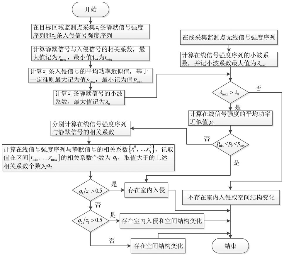步骤二十一 、在线阶段 ,在每个监测点处采集未知状态的RSS序列步骤二十二、计算R0的小波系数 并记其最大值为步骤二十三、若λmax>λ0,转步骤二十四;否则,不存在室内入侵或空间结构变化;