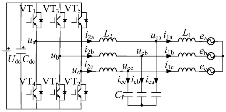 S2:通过所述基于网侧电流、逆变器侧电流和电容电压多变量模型的预测数学模型,构建基于网侧电流、逆变器侧电流和电容电压的价值评价函数,具体为:其中:J为价值评价函数,λi1(k+2)为αβ坐标系下的网侧电流在第k+2个采样周期的预测值的权重系数,λuc(k+2)为αβ坐标系下的交流滤波电容电压在第k+2个采样周期的预测值的权重系数, 为αβ坐标系下的网侧给定电流在第k+2个采样周期的α分量,i1α(k+2)为αβ坐标系下的网侧实际电流在第k+2个采样周期的α分量, 为αβ坐标系下的网侧给定电流在第k+2个采样周期的β分量,i1β(k+2)为αβ坐标系下的网侧实际电流在第k+2个采样周期的β分量, 为αβ坐标系下的交流滤波电容电压在第k+2个采样周期的给定电压α分量,ucα(k+2)为αβ坐标系下的交流滤波电容电压在第k+2个采样周期的实际电压α分量, 为αβ坐标系下的交流滤波电容电压在第k+2个采样周期的给定电压β分量,ucβ(k+2)为αβ坐标系下的交流滤波电容电压在第k+2个采样周期的实际电压β分量,为αβ坐标系下的逆变器侧给定电流在第k+2个采样周期的α分量,i2α(k+2)为αβ坐标系下的逆变器侧实际电流在第k+2个采样周期的α分量, 为αβ坐标系下的逆变器侧给定电流在第k+2个采样周期的β分量,i2β(k+2)为αβ坐标系下的逆变器侧实际电流在第k+2个采样周期的β分量;