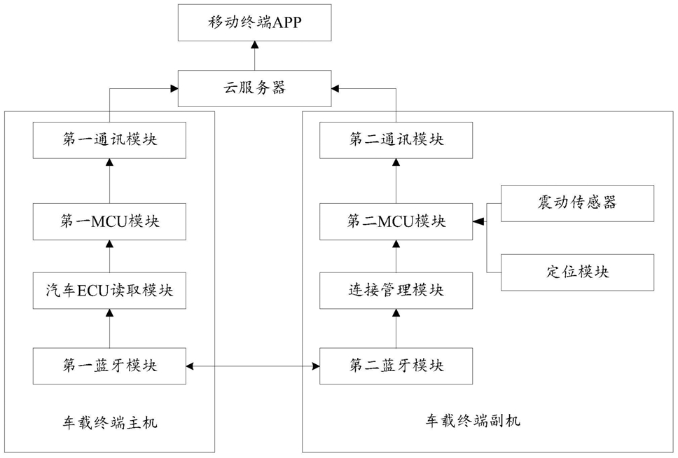 1.基于OBD系统的车辆防盗系统,其特征在于:包括车载终端主机、车载终端副机、云服务器及移动终端APP,所述车载终端主机包括第一MCU模块、汽车ECU读取模块、第一通讯模块、第一蓝牙模块,所述车载终端副机包括第二MCU模块、第二蓝牙模块、第二通讯模块、定位模块、连接管理模块、震动传感器;